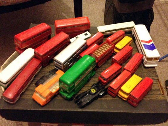 | Buses. A lot of buses. My favourite is the green one. Just to clear up any potential confusion, please note that the Batmobile and KITT from Knight Rider seen here are not buses. |